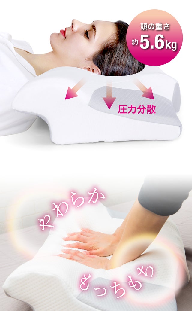 頭を包み込むような柔らかさと形状、頭をやさしく支える。頭の重さは「5.6キロ」(ボーリングの玉くらい)なので、睡眠中の負担が一番かかっています。