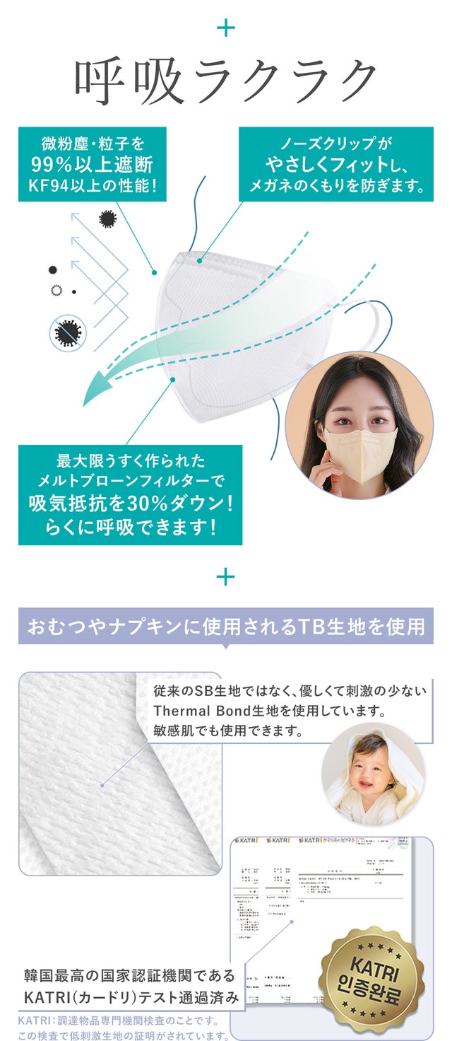 マスクの防御力はそのままに、生地、フィルター、ノーズグリップにこだわり抜くこと呼吸ラクラク(しかもメガネのくもりも防ぎます)を実現しました!