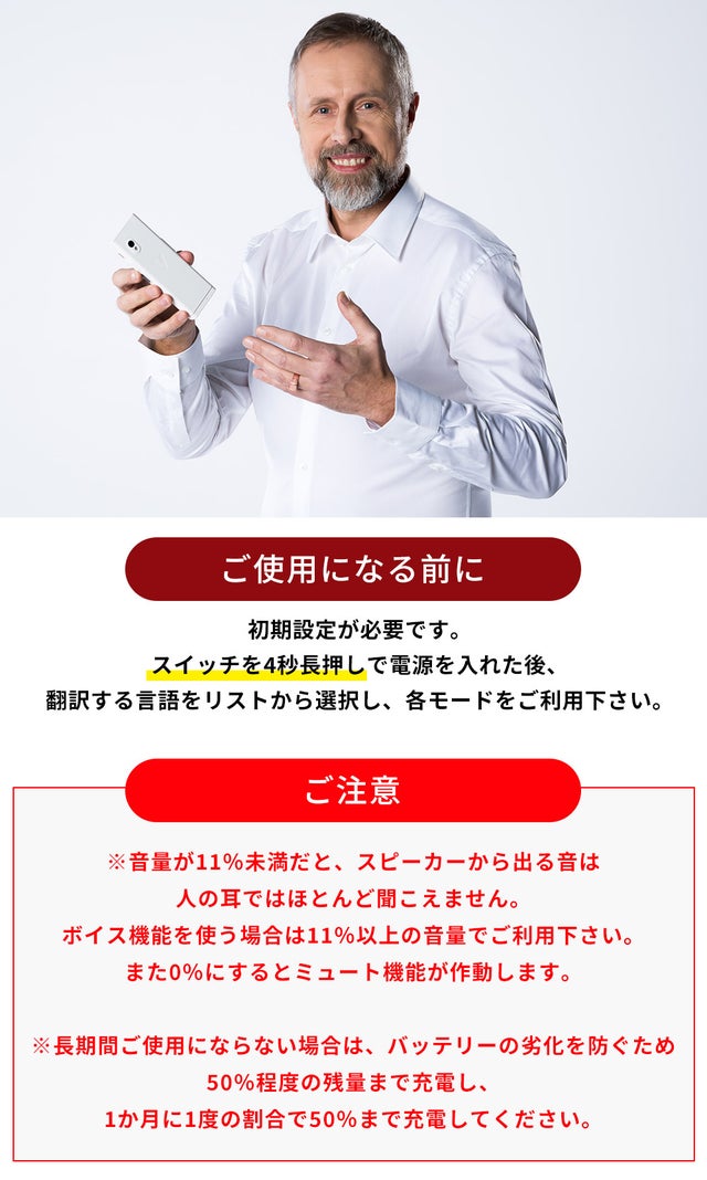 一から英語や他言語を学び直す時間はなくても、こういう文明の機器に頼るのも1つの方法だと思うのです。お守り代わりに小さなポケットサイズの通訳さんとして、外国語が全く話せない人でも安心してお使いいただけます。もちろん、英語は話せるけど他の言語はちょっと、という方にもぜひおすすめしたいです。