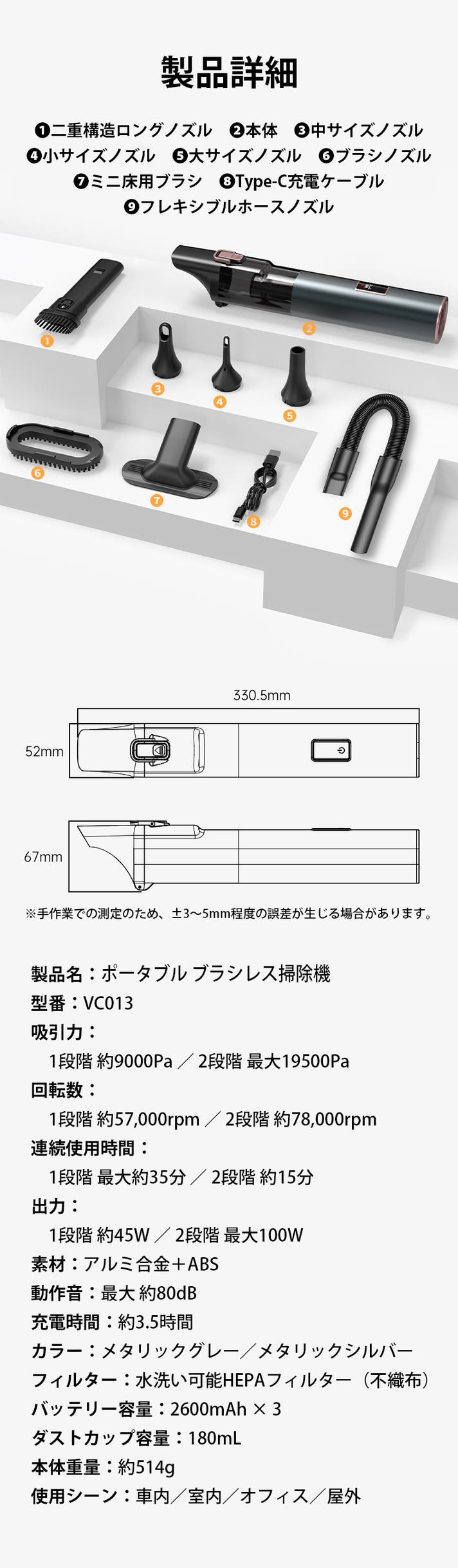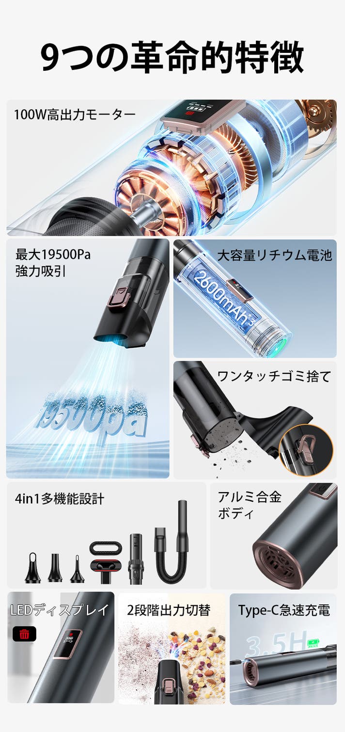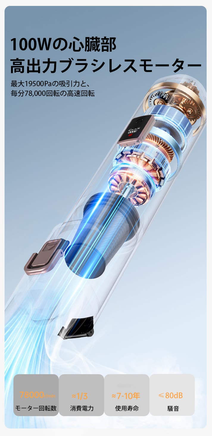 100Wの高出力ブラシレスモーターを搭載し、高回転でも安定したパワーを維持します。長時間の使用や高負荷の作業でも性能が落ちにくく、吸引力をしっかり発揮し続けられます。