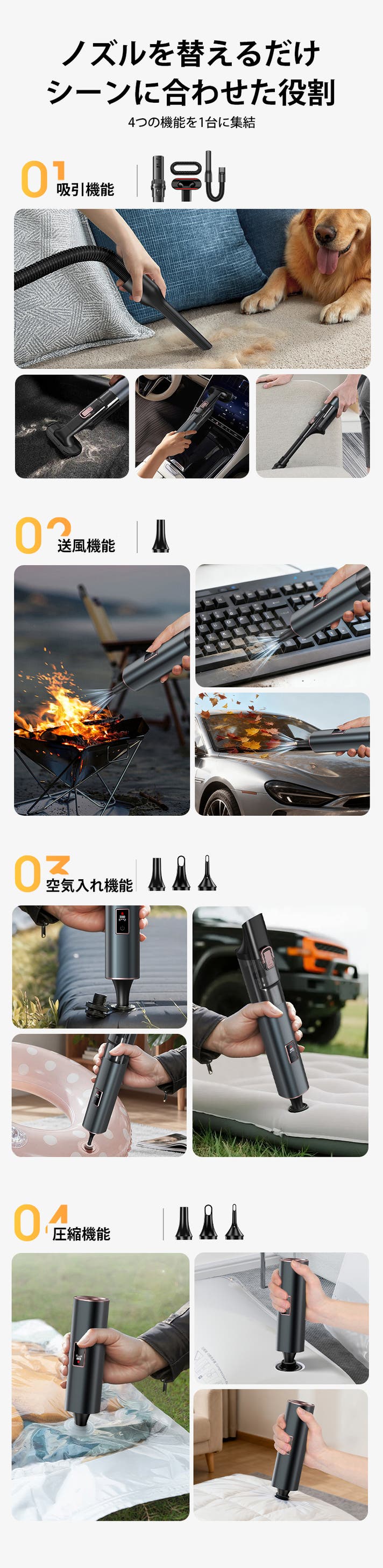 - 6つのノズルで掃除・送風・空気入れ・圧縮の4役を1台に集約!掃除の常識を覆す
