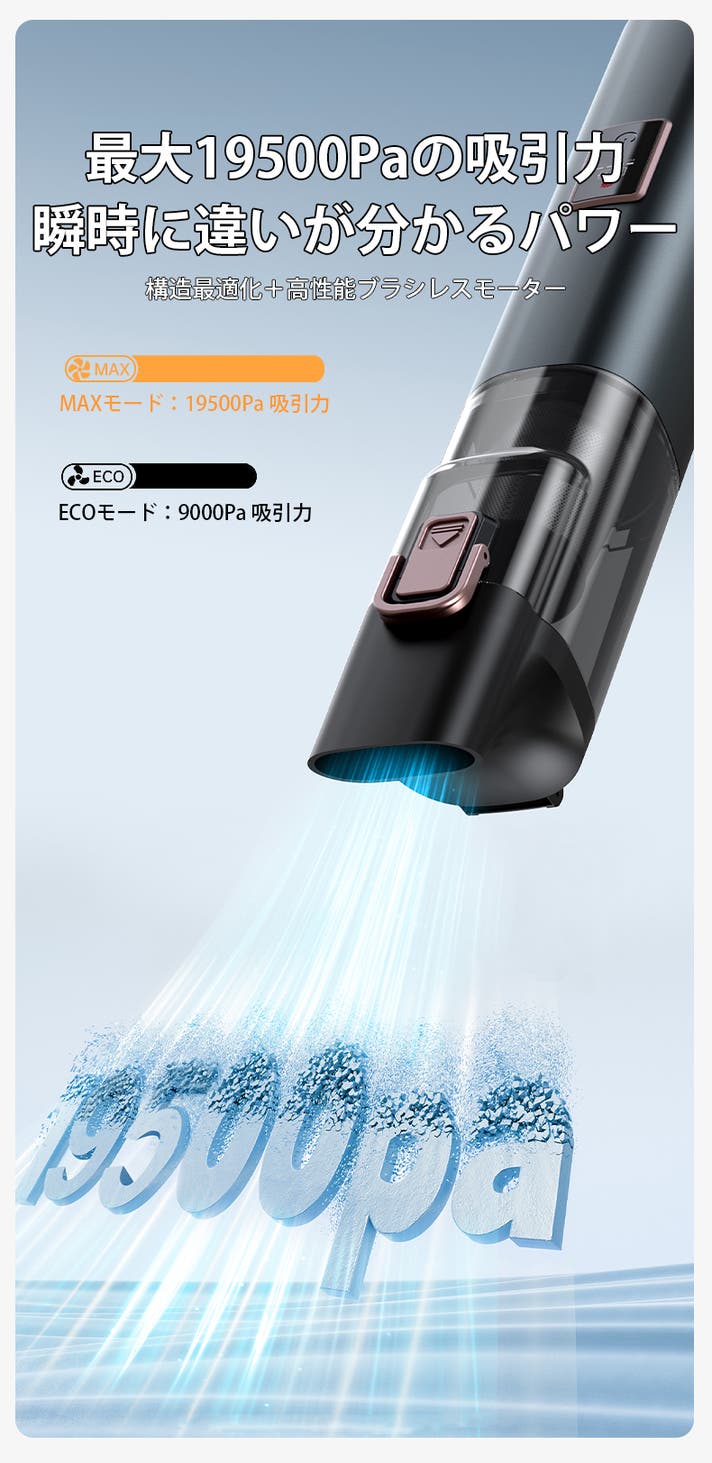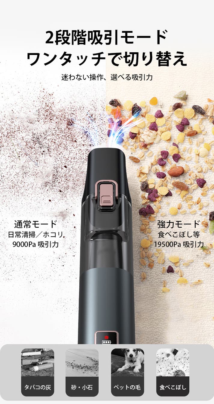 - 2モード切替×最大19,500Paで隙間汚れまでスッキリ!ワンタッチでゴミ捨ても簡単