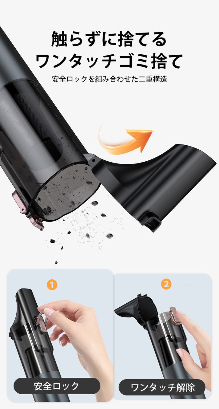 ボタン操作ひとつでダストカップを開けられ、手を汚さずにゴミ捨てが行えます。清掃後の片付けがスムーズになり、日常の掃除を気軽に続けられます。