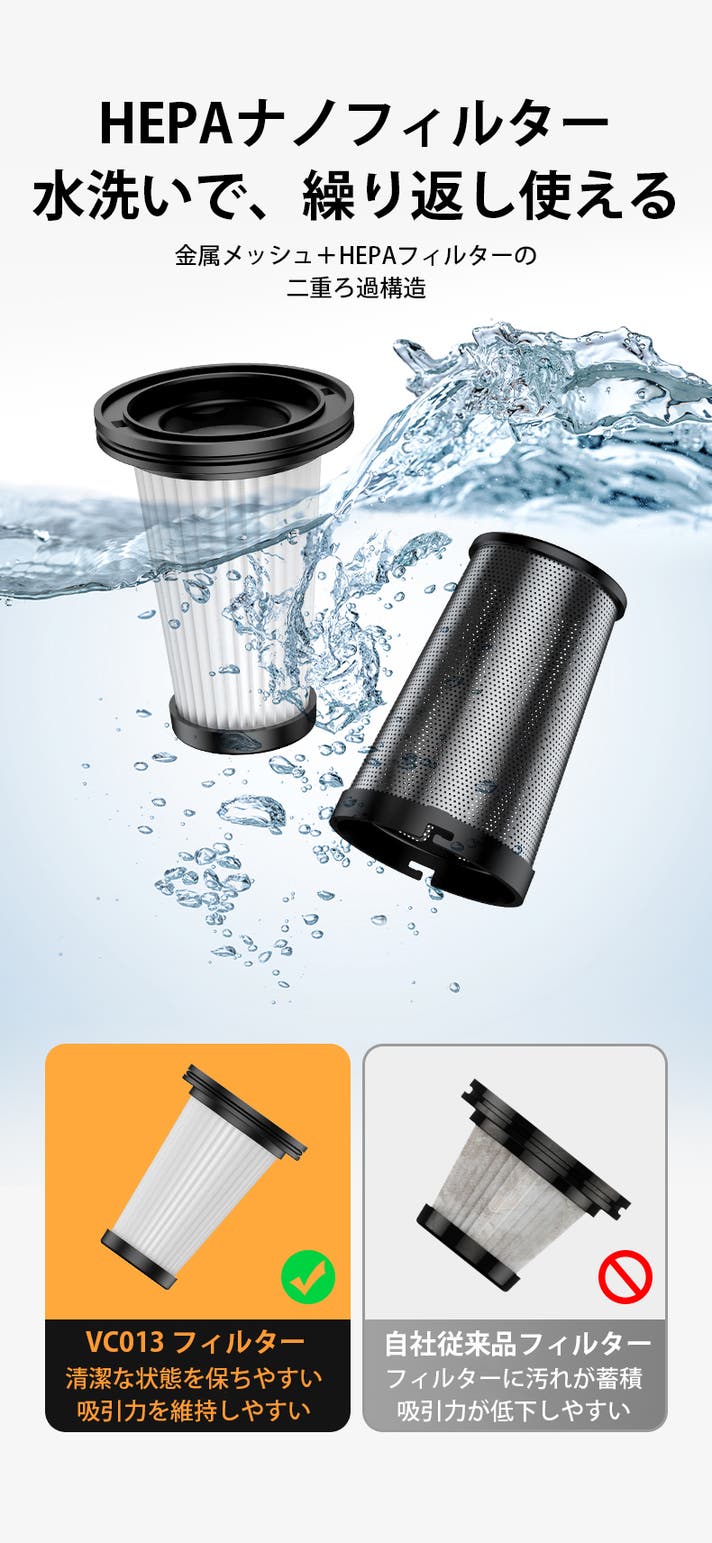HEPAフィルターは水洗いに対応しており、付着したホコリや汚れを落として繰り返し使用できます。清潔な状態を保ちやすく、吸引性能の低下を抑えながら長く使えます。