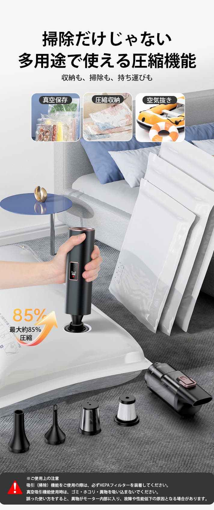 衣類や収納袋の圧縮にも対応した圧縮機能を搭載しています。旅行や季節物の整理など、日常のさまざまな場面で活躍します。