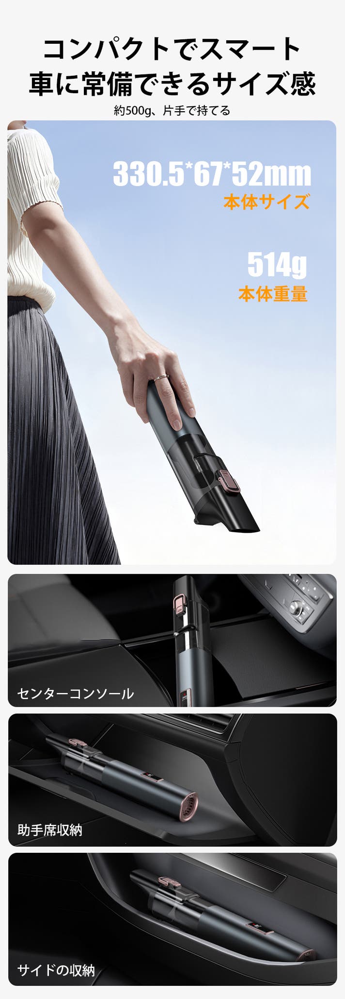手に取りやすいコンパクトサイズで、使用後も収納場所を選びません。車内や棚の隙間にもすっきり収まり、必要なときにすぐ取り出して使えます。