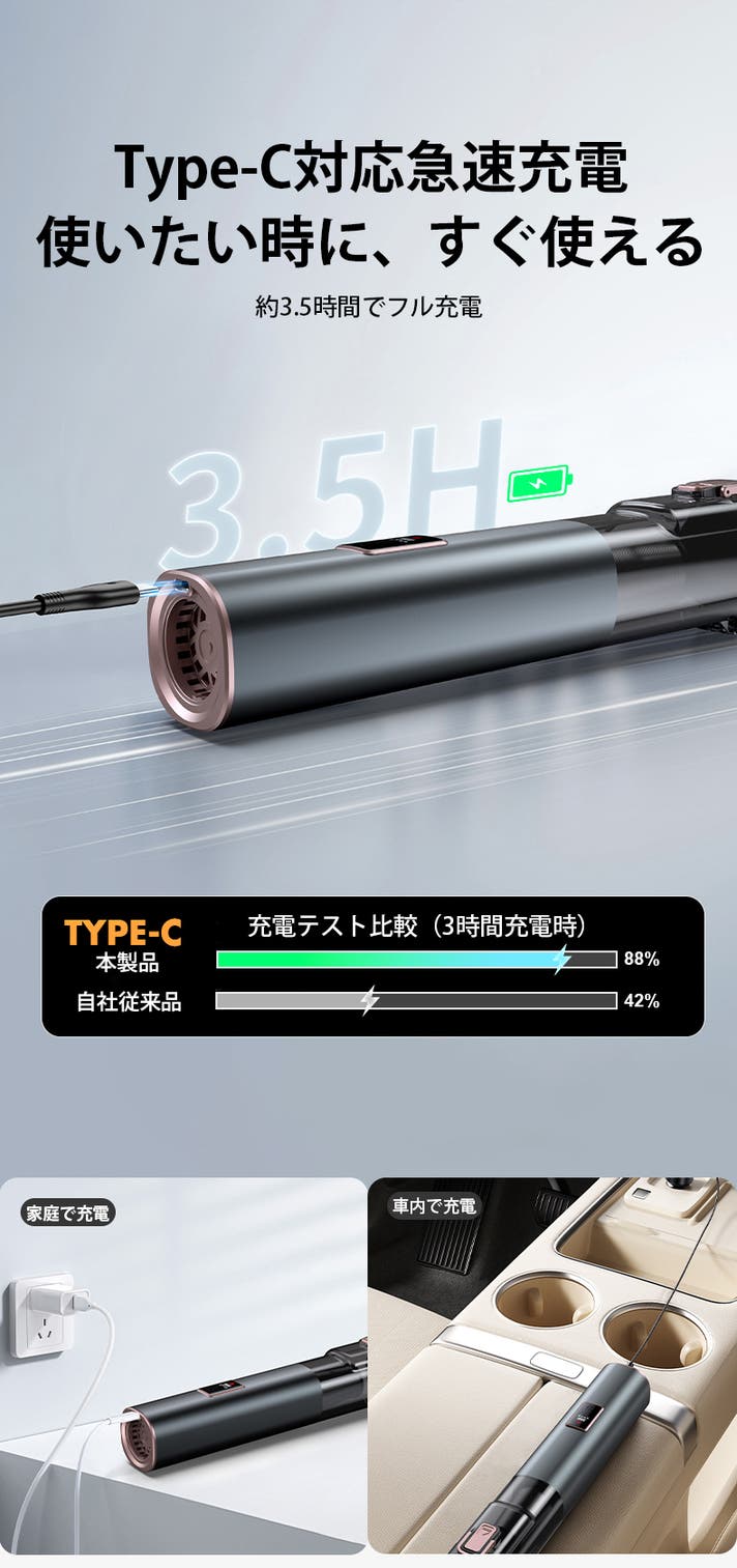 Type-C充電に対応し、短時間で効率よく充電できます。使用前の準備や合間の充電がしやすく、使いたいときにすぐ使えます。