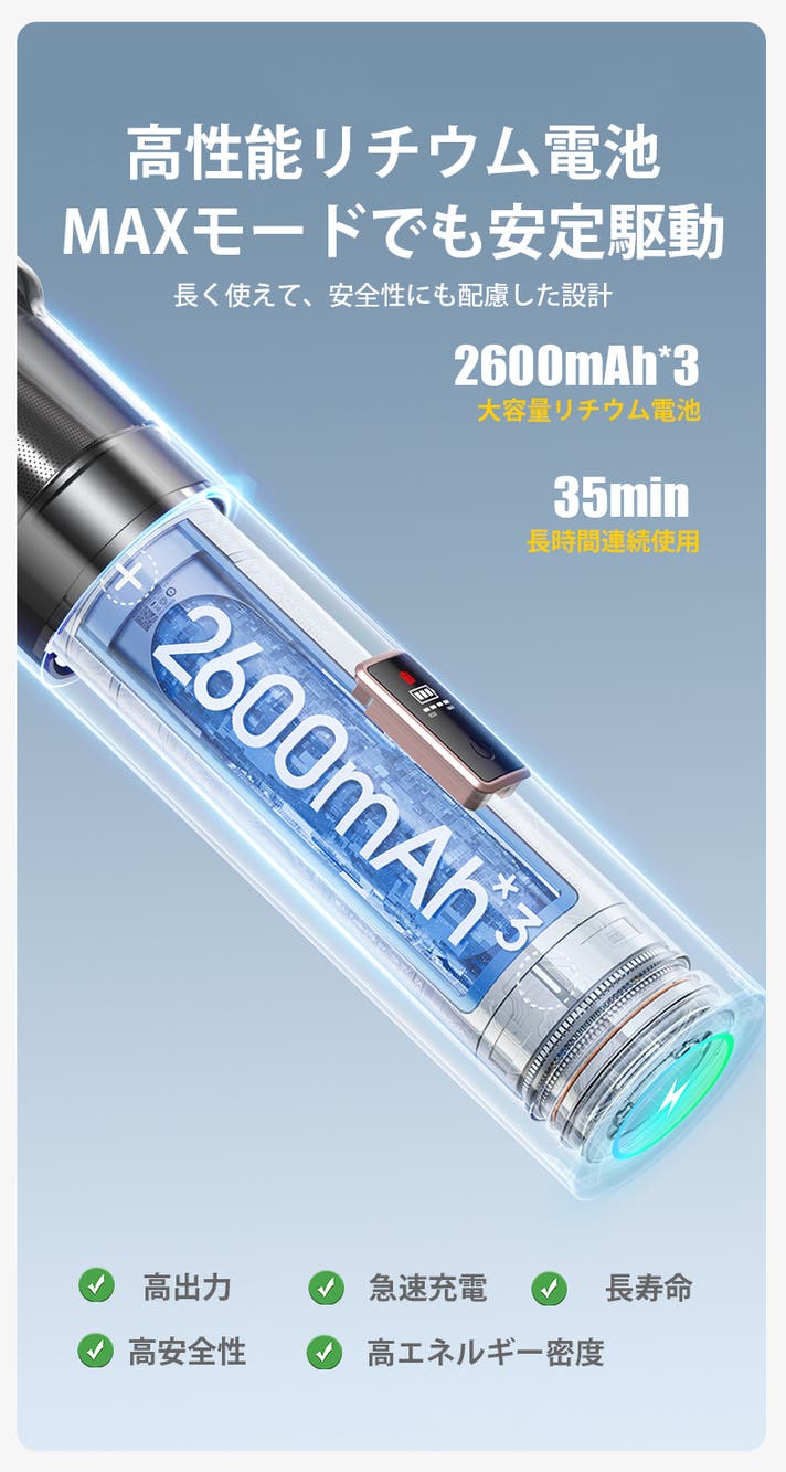 - コンパクト設計+アルミ合金ボディで携帯・収納もしやすい!最大35分間連続稼働