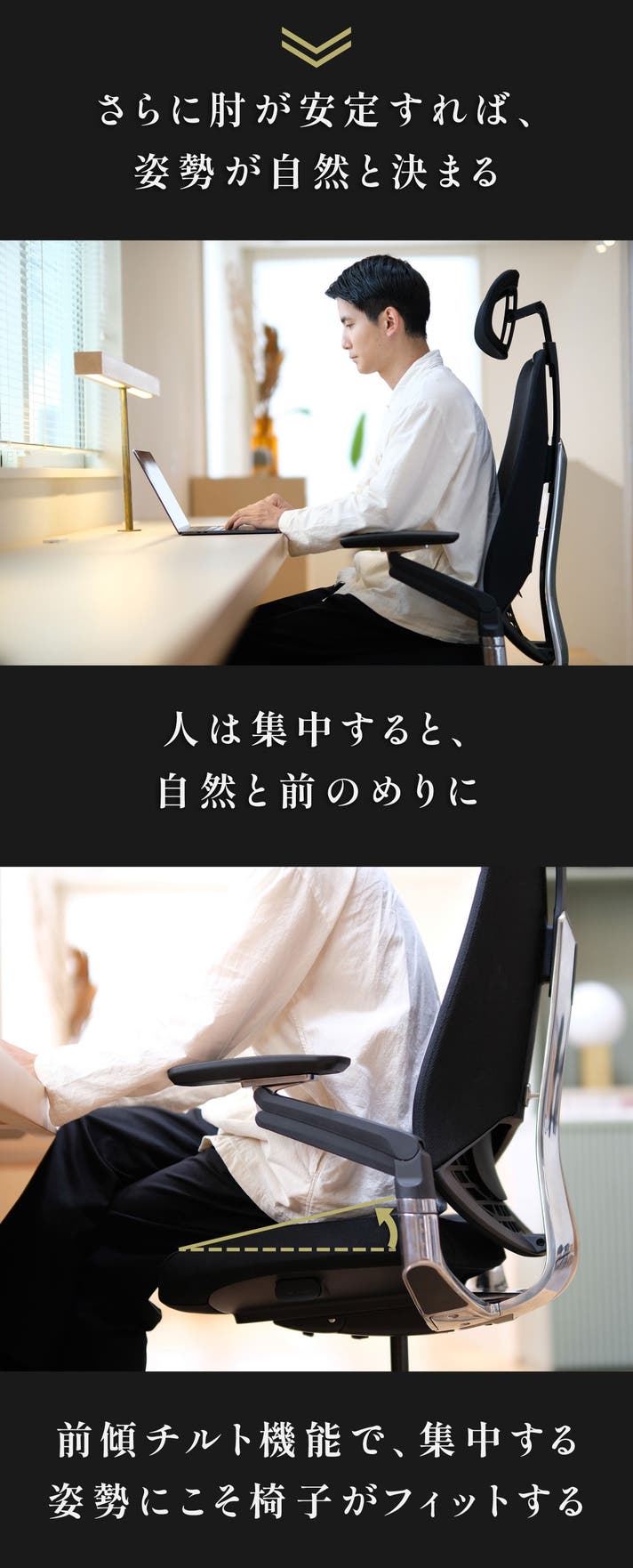 アームを前後に動かすだけで、その瞬間の姿勢にフィットし、作業から休憩への