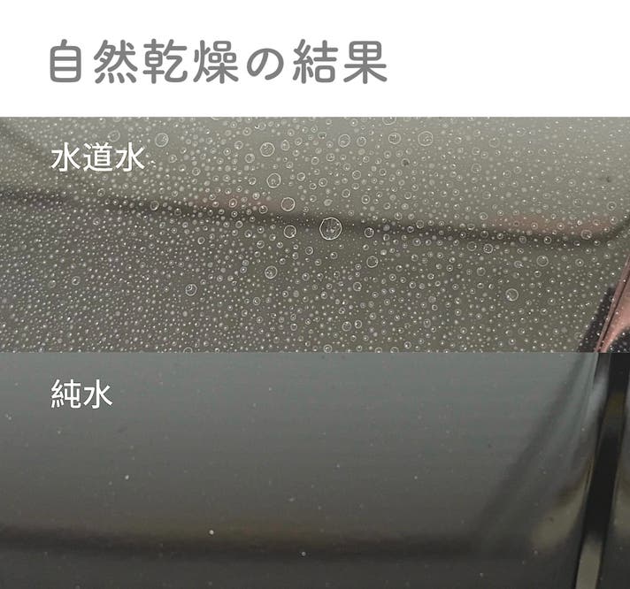 いくら丁寧に拭いても、水道水であれば微細なミネラルが表面に残り、乾くと同時に白い跡を残します。