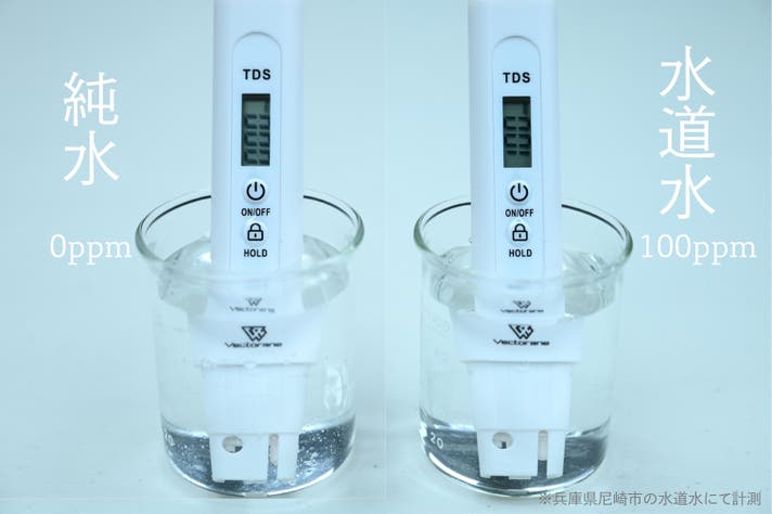 左側:KOBUN+Switchを水道水に繋ぐと、100ppmから0ppmになり、完全に純水になりました。