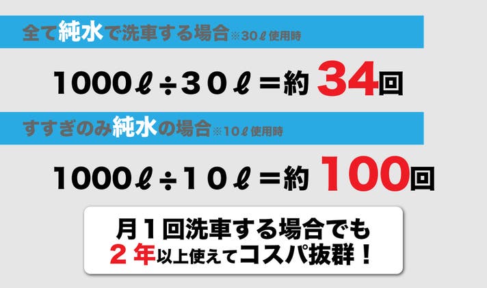 たとえば洗車1回に30L使用した場合、約33回分の洗車が可能。