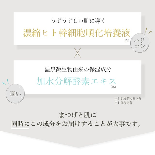 濃縮ヒト幹細胞培養液や加水分解酵母エキス(コラーゲン)以外にも、様々な天然由来成分を加え、肌とまつげのコンディショニングにこだわった配合となっています。