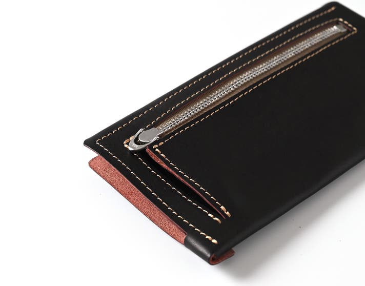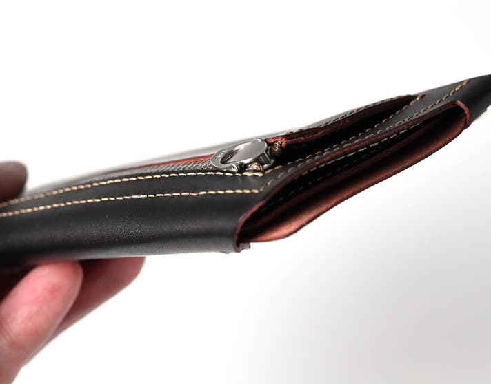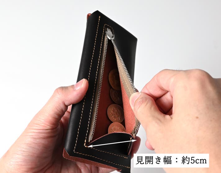 硬貨収納には、あえてジッパーを残しました。薄型財布だからこそ、「しっかり閉じられる」という安心感を大切にしたかったからです。また、マチを設けることで、薄さを保ちながらも、日常使いに十分な収納力を確保しました。