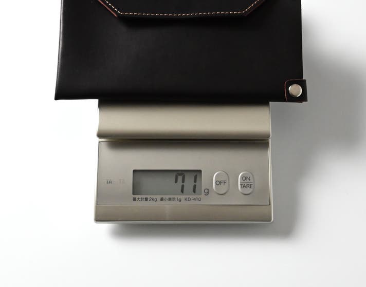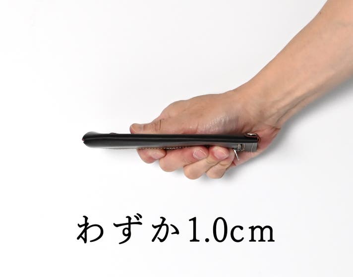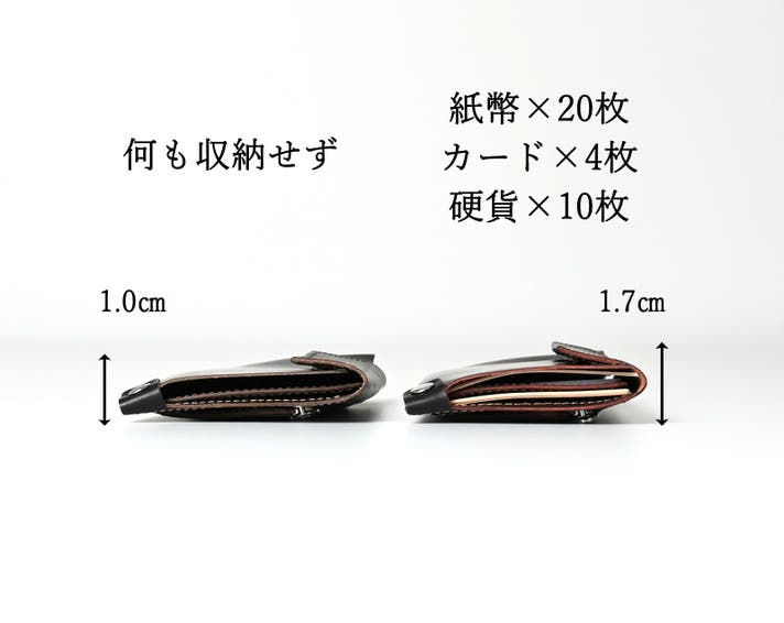 何も収納しない状態で1.0cm。紙幣20枚、カード4枚、硬貨10枚。日常に十分すぎる量を入れても1.7cm。写真の通り収納前と薄さの印象は、そのままです。