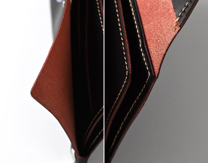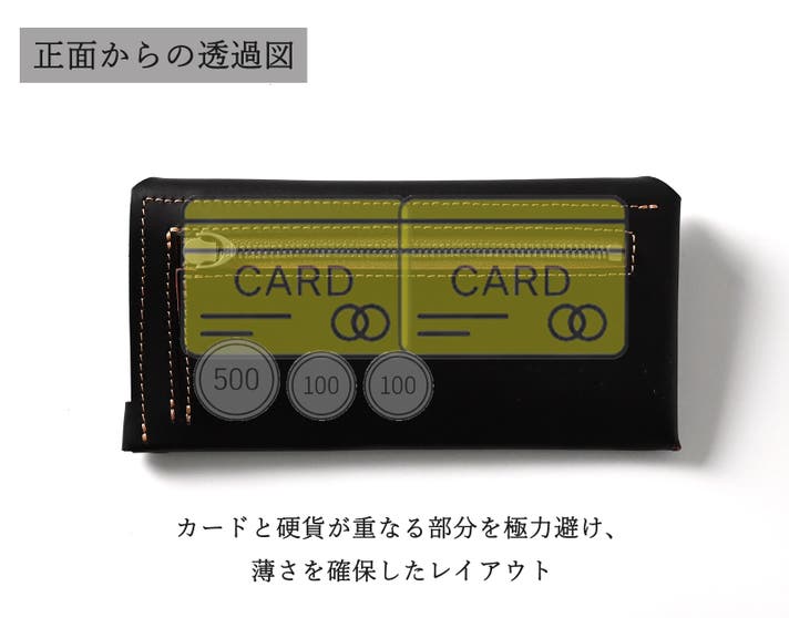VELIN(ヴェリン)では、内側の微細なレイアウトを調整することで、カードと硬貨など収納物の偏りを避け、均一な薄さを保てるように工夫を施しています。
