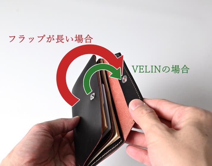 VELIN(ヴェリン)では、フラップの長さを全体の約1/3に設定。開閉時のストロークを短くすることで、無駄のない、スムーズな使い心地を実現しました。