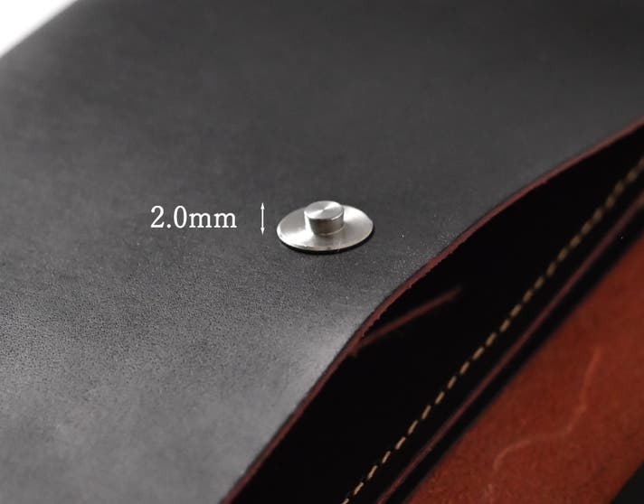 1.0mm厚のレザーに合わせて選んだのは、わずか2.0mmの極薄メタルパーツ。段差を感じさせず、革の滑らかな手触りをそのまま残します。