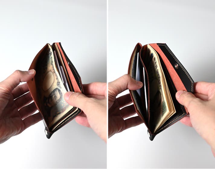 1,000円札と10,000円札で分けて収納したり、お札とレシートを仕分けたり。使い方に合わせて、自然に整理できます。ミニマムなサイズ感の中でも、中身が重ならず、迷いなく取り出せます。