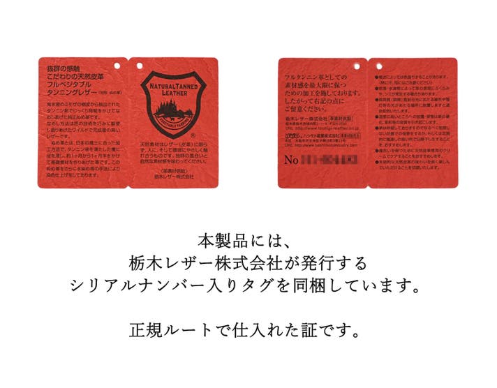 お届けの際には、全てのリターンに栃木レザー正規品の証であるシリアルナンバー入りタグを同梱いたします。