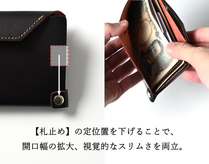 そこでVELINでは、札止めを端に寄せ、サイズも最小限に設計。L字財布のように大きく開き、中身を一目で確認できる視認性を実現しました。