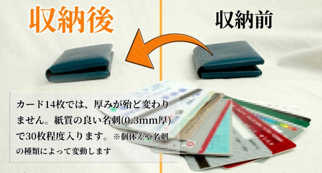 元々名刺入れ自体が小さいアイテムなので、よりコンパクトさを実感しやすいです。ただ収納枚数が少ない場合、ゆっくり開閉するとズレてしまいます。もちろんある程度の量を入れていただけると問題ございません。