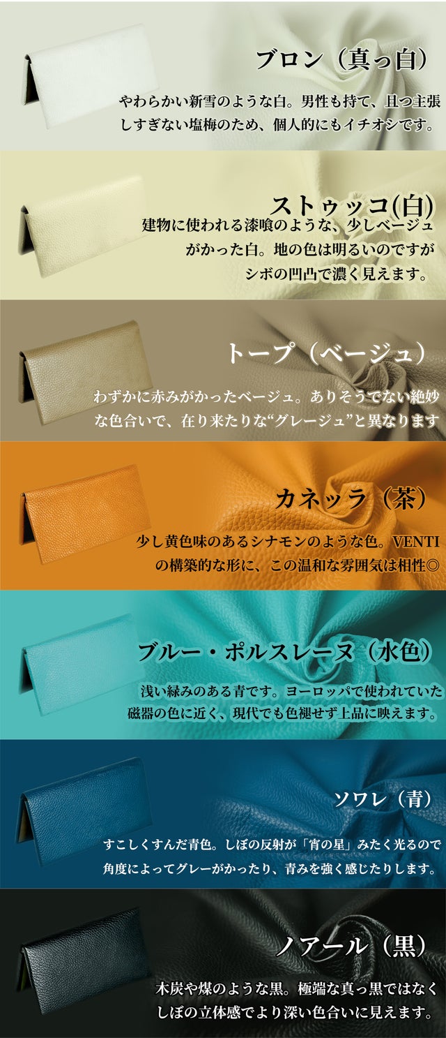 やわらかい雰囲気がお好みの方にはマストロット社のイタリア製しぼ革を用意しました※名称にはイタリア語とフランス語が混在しており、語学に詳しい方は不快に感じる可能性がございます。また色味の名前はイメージです。
