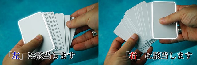 トランプか複数枚のプラスチックカード(クレジットカードやポイントカード等)を用意して頂き、手元で広げ、一番上のカードが右手ならば「右」、左手ならば「左」がお勧めです。
