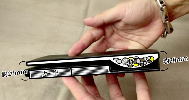 硬貨31枚、カード22枚、紙幣24枚入れても、厚みは約20mm