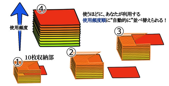 トランプ手札の送り方と同じです。またカードを仕舞う際、束の一番上に入れる事で、頻度の高いカードほど上部に残り、使わないカードはどんどん下に溜まります。