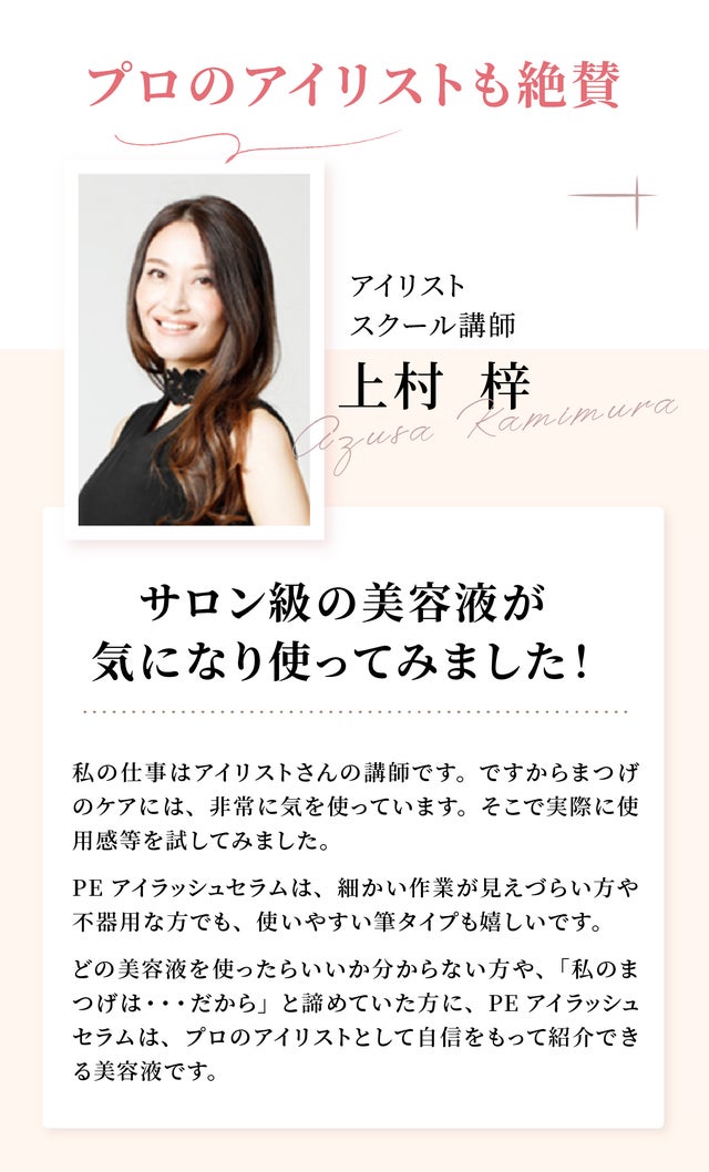 PEアイラッシュセラムは、厳選した成分と、長年研究した配合バランスを用いて、開発したサロントリートメントを、更にご自宅用にバージョンアップしてつくりました。