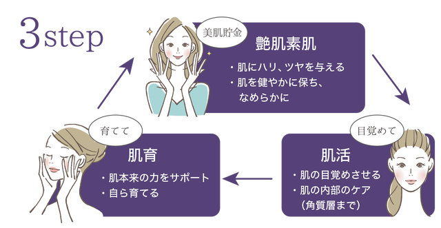 <肌活>肌を整え、<肌育>肌に潤いを与え、肌本来の美しさを目指します。<艶肌素肌>ハリ、ツヤ、潤いのある肌を目指し、美肌を重ねます。