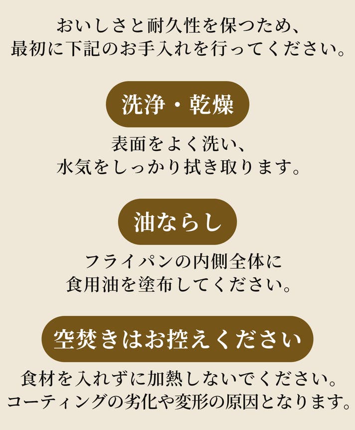 A:空焚きはコーティングの剥がれや変形を防ぐため避けてください。