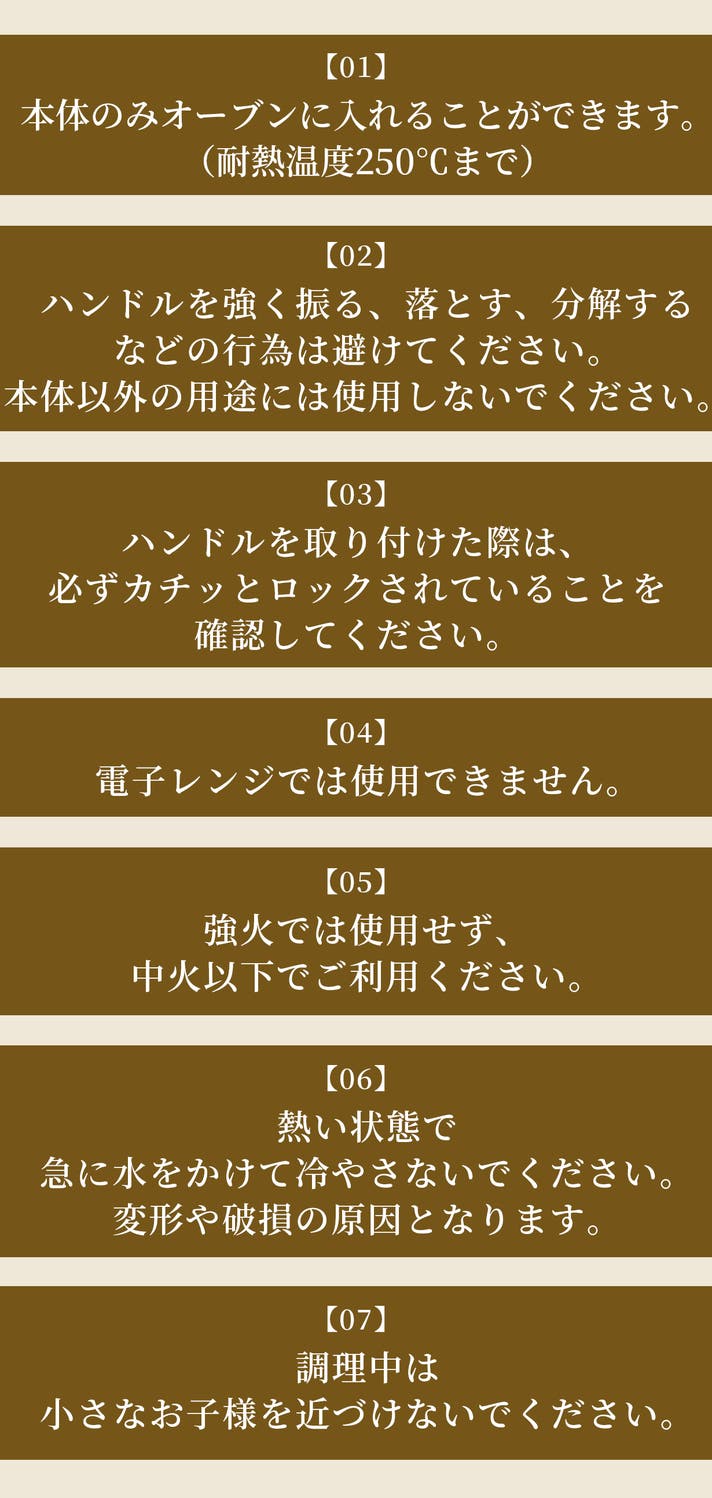 A:熱伝導性のため、加熱は中火以下にし、250°C(450°F)を超えないようにしてください。