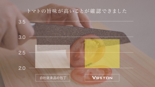 トマトを切ってから180秒後に後味を測定。数値として0.2以上が有意差とされています。結果は、VgSTONの方が従来の包丁より旨味においては0.29ポイント、コクでは0.27ポイント高いということが証明されました。AISSY(株)調べ