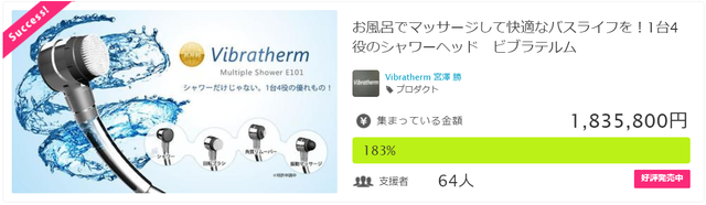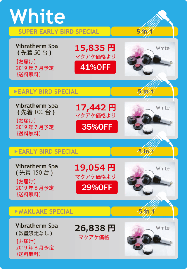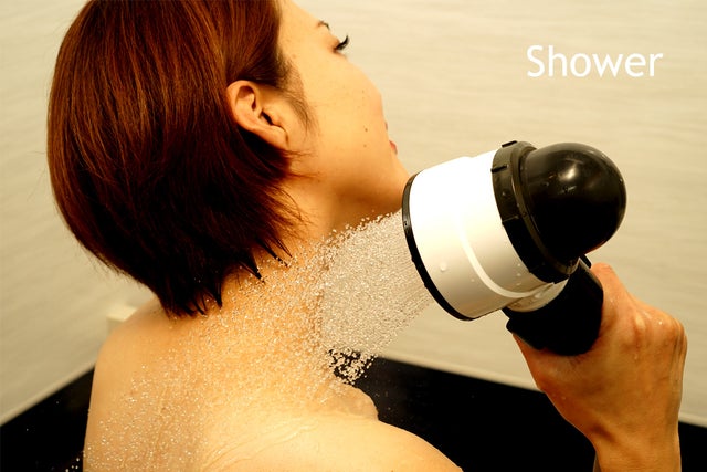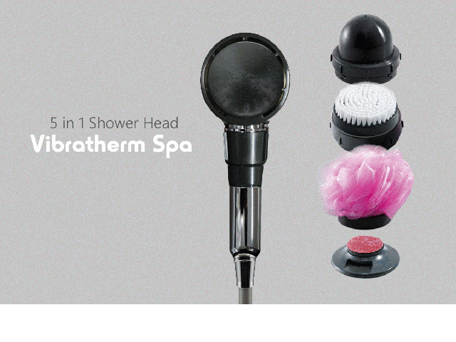 さらに、アタッチメントは振動マッサージ・回転ブラシ・角質リムーバーの3種類、シャワーを含め 1台4役のシャワーヘッド」を開発しVibratherm E101&102として2017年3月29日、クラウドファンディング「Makuake」にローンチしました。