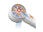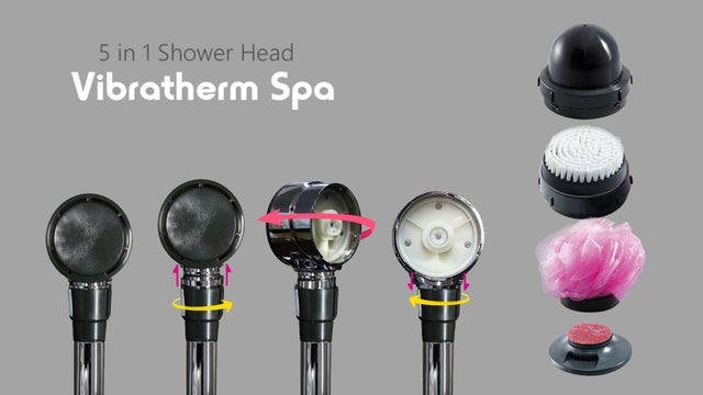一般的なシャワーヘッドは、「水が出るだけ」ですが、ビブラテルム スパはシャワーだけじゃなく、流水によるヘッド内のスクリューの回転軸を原動力として振動バイブや回転ブラシや角質除去などのビューティースパ機能を持ち、一つの装置なのに1台5役の斬新なシャワーヘッドなのです。
