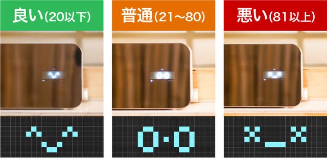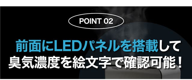 前面部のLEDパネルで臭気濃度を絵文字で表示してくれるので、室内空気の状態をを目で確認することができます。