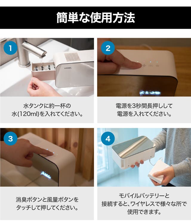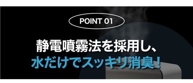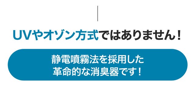 - フィルター不要!有害物質の心配なし!水だけを使った静電噴霧法を採用!ナノ水滴が強力消臭!