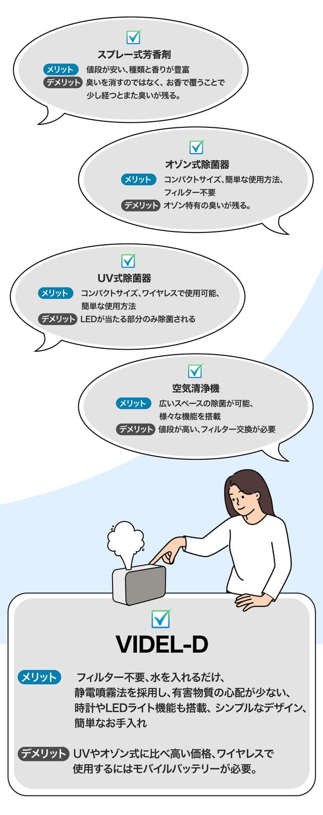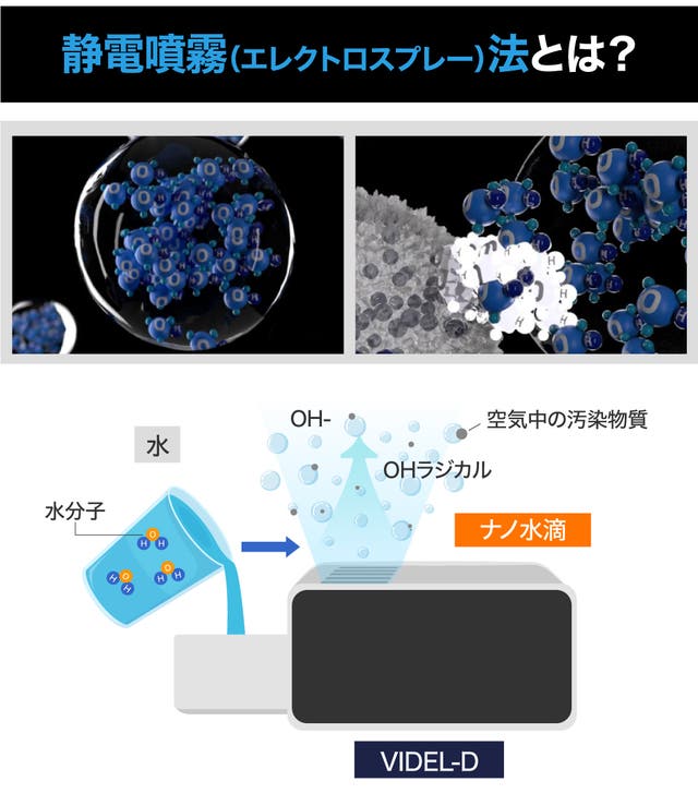 VIDEL-D(バイデル・ディ)は静電噴霧法を採用し、水だけで空間にとどまる嫌な臭いを効果的に除去します。