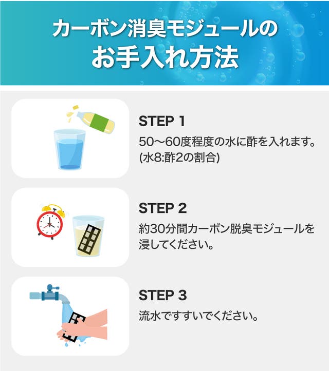 カーボン消臭モジュールも交換する方式ではなく、定期的に酢を混ぜた水に浸しておくだけで簡単に再利用できます。