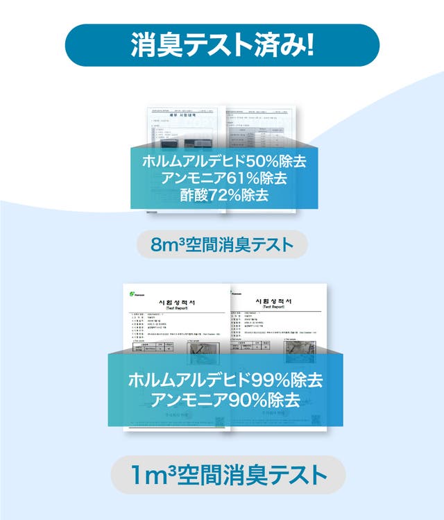 8m³の空間でホルムアルデヒド50%、アンモニア61%、酢酸72%が除去されることが確認されました。 (動作時間 : 3時間)
