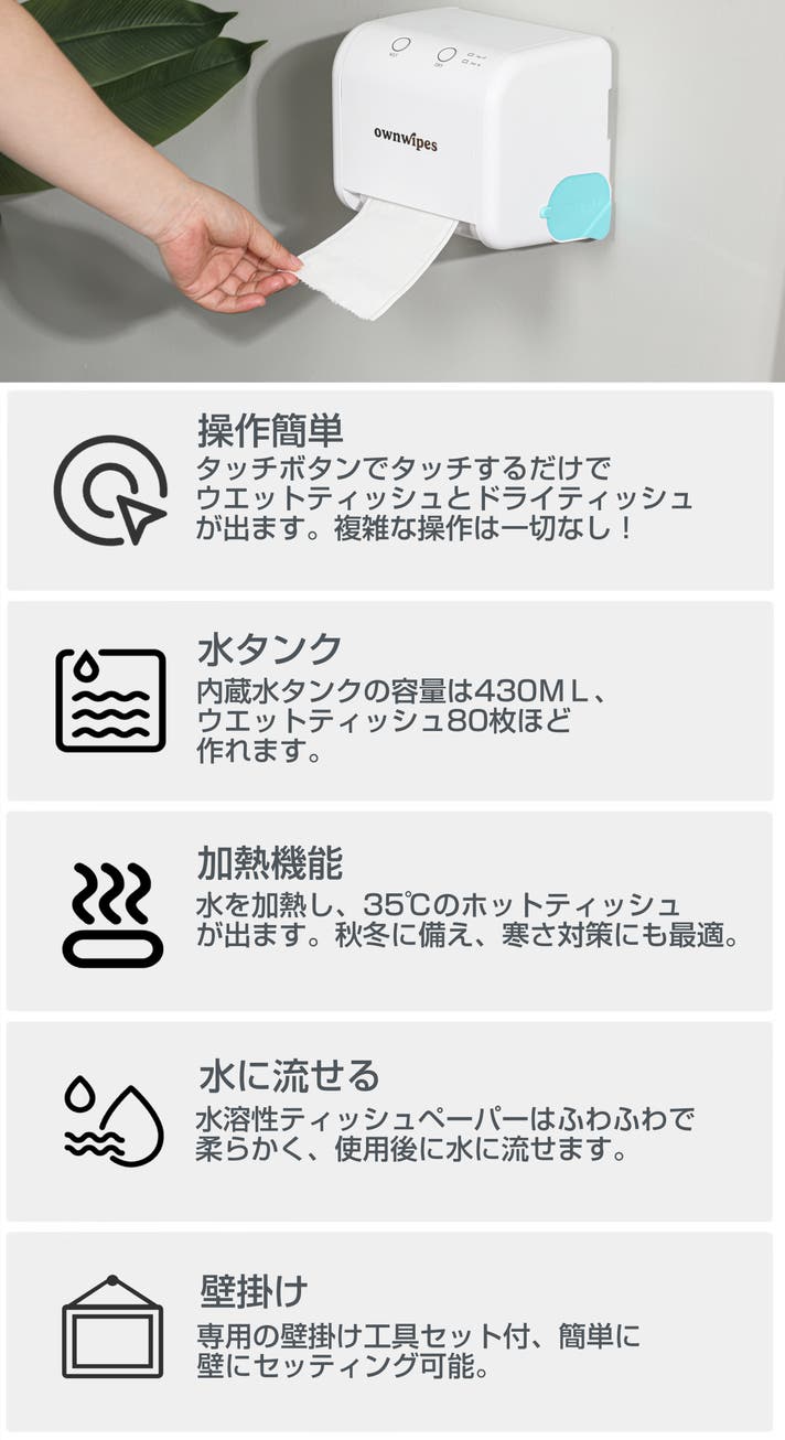 A5:ownwipesティッシュマシンはスマート温度制御システムを搭載しており、水温を適温に保ち、過熱を防ぎます。高品質のセラミックヒーターを採用し、耐熱性・放熱性に優れた信頼の設計となっています。