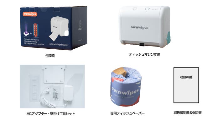■内容物:ownwipesティッシュマシンx1、ACアダプターx1、壁掛けセットx1、ownwipes専用ティッシュペーパーx1、取扱説明書x1