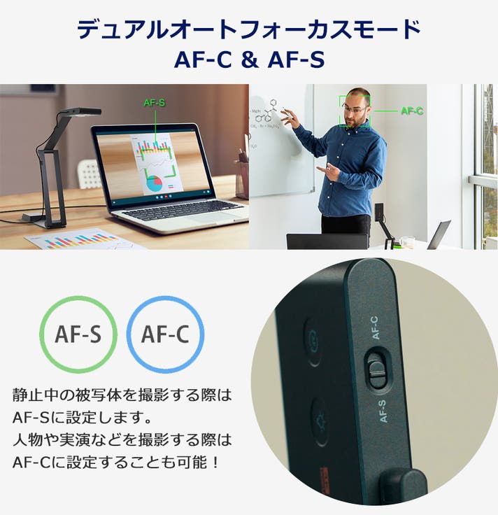 書類や資料をくっきり撮影したいときは、AF-Sモードで一度ピントを固定。動きのある人物や手元の操作をリアルタイムで映したいときには、AF-Cモードで被写体の動きを追従しながら常に鮮明な映像を保ちます。