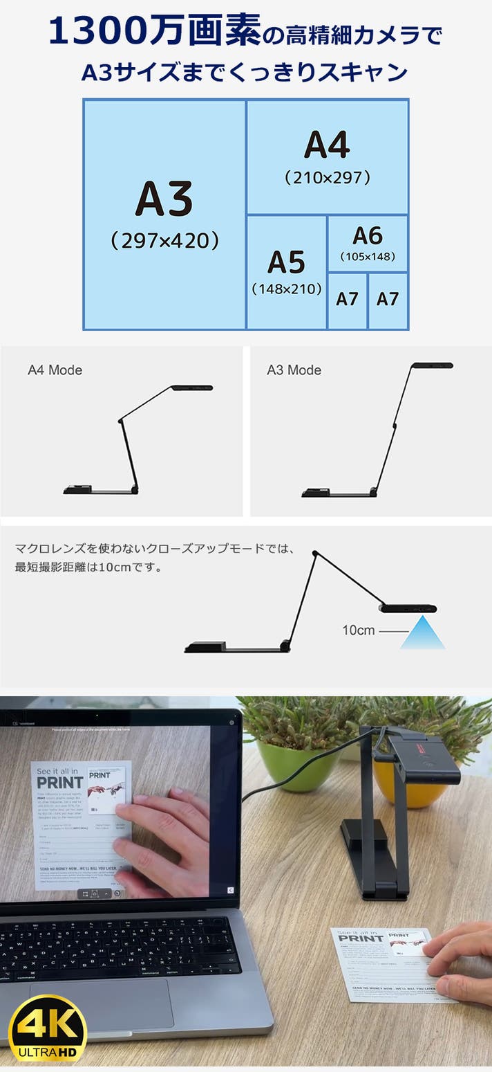 従来の据え置き型スキャナーの常識を覆す、薄型・軽量ボディと洗練された折りたたみデザインを採用し、これまで本や雑誌、バインドされた書類のスキャンに伴う煩雑な作業「押し付けや位置調整、裏返し、編集といった手間」から解放します。