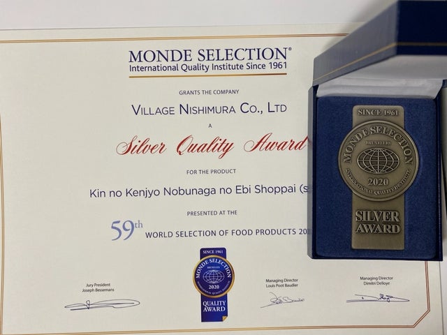 完成した商品2個とモンドセレクション銀賞受賞商品(信長のえびしょっぱい)のセット