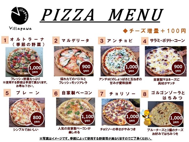 初めてのお客様からの質問で多いのがビラパワのメニュー8種類のピザからの選択です。ビラパワの定番人気はマルゲリータピザ、季節の野菜のピザ、自家製ベーコンのピザです。