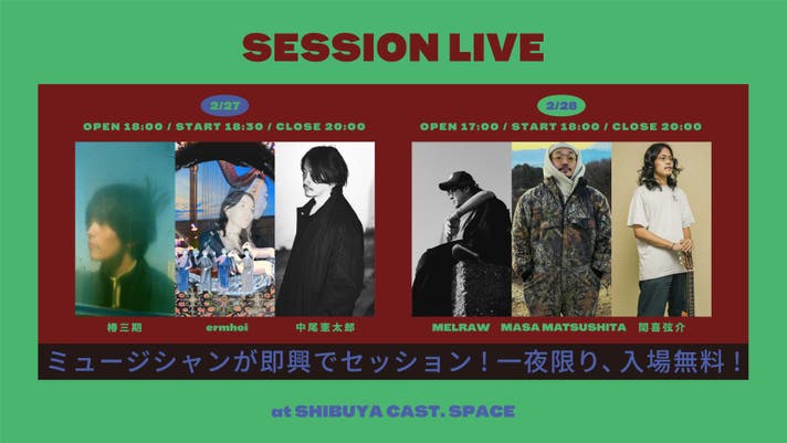 会場の渋谷キャスト スペースは屋内でコンパクトなため、目の前で全身で音を浴びることができると思います。入場無料です。