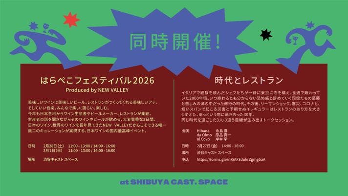 初の試みとして二子玉川の酒屋「NEW VALLEY」の店主・千葉芳裕さんが手がけるワインフェス「はらぺこフェスティバル」も、渋谷キャスト スペース(屋内会場)にて同時開催します!